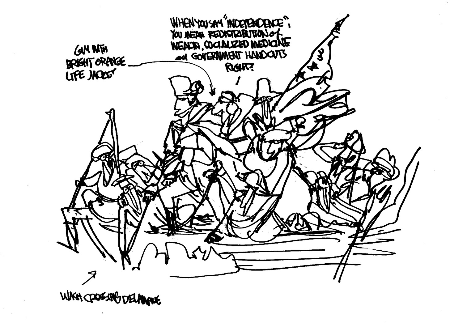 Editor’s Note: Michael’s favorite U.S. president is George Washington, with Ronald Reagan as the more modern runner-up. I find it fascinating to see how artists portray those subjects for whom they feel great affection or respect. Caricatures become gentler, larger-than-life figures become more relatable and sympathetic. Already the subject of many famous depictions, the George Washington of today’s cartoon looks like he could use a hug and a stiff drink; I wonder what any of our early founders would have thought of fighting so hard for independence, only for their descendants to beg for it to be offloaded.